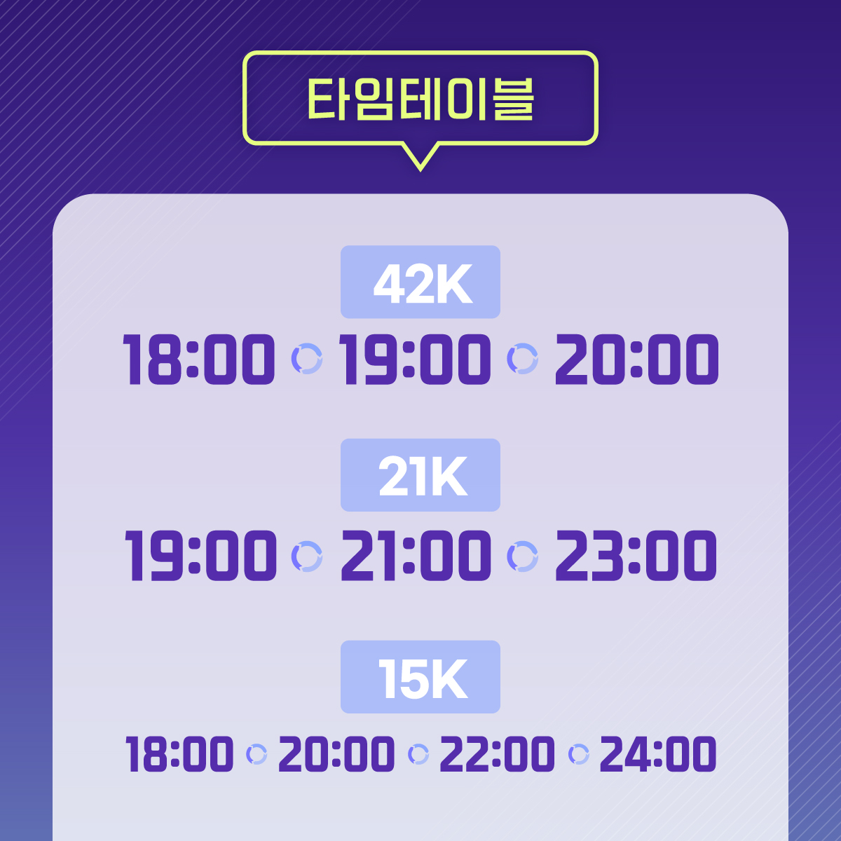 - 주최 측은 주로 상의 갈림길이나 주요 포인트에 표지판과 스태프를 배치합니다. 그러나 야간 레이스 특성상 코스를 혼동할 수 있으므로 사전에 코스를 숙지하시기 바랍니다.