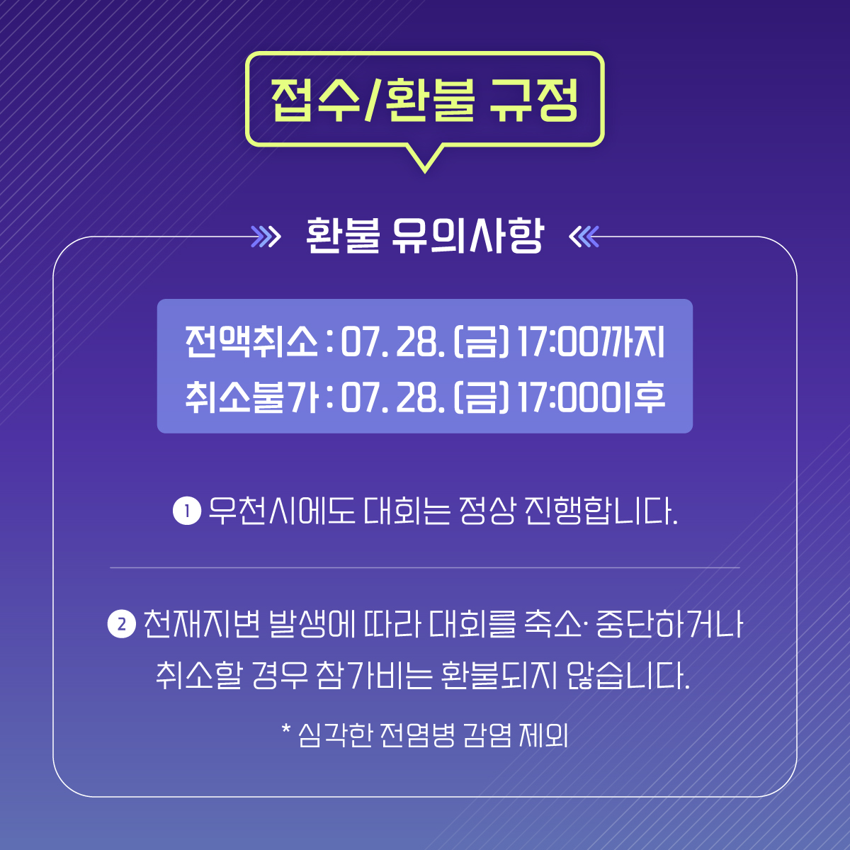 천재지변 발생에 따라 대회를 축소·중단하거나 취소할 경우 참가비는 환불되지 않습니다.