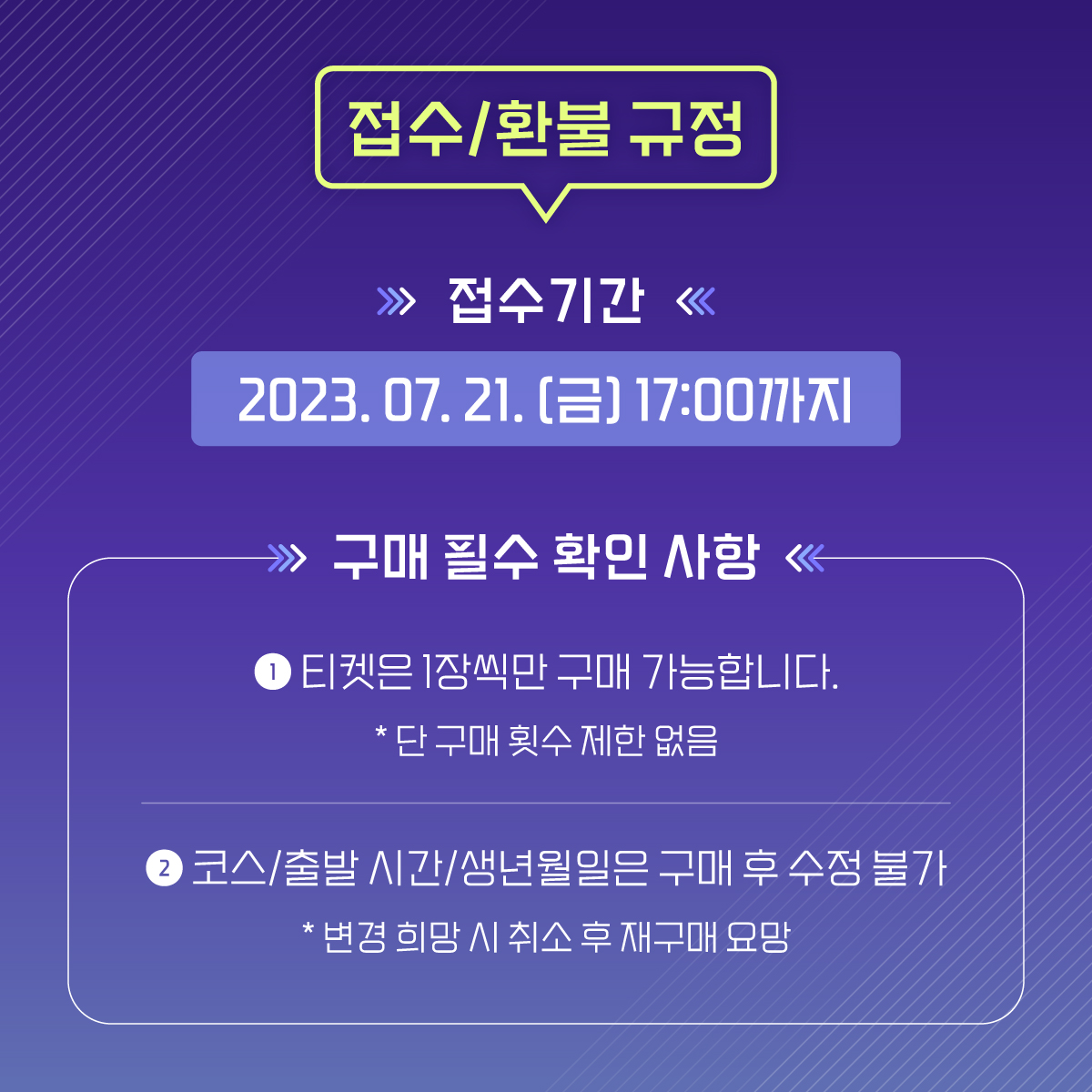 ✔모든 티켓 접수는 2023. 07. 21. (금) 17:00까지 가능하며, 환불은 2023. 07. 28(금) 17:00까지 가능합니다.