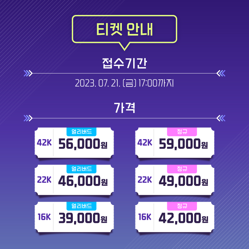✔모든 티켓 접수는 2023. 07. 21. (금) 17:00까지 가능하며, 환불은 2023. 07. 28(금) 17:00까지 가능합니다.